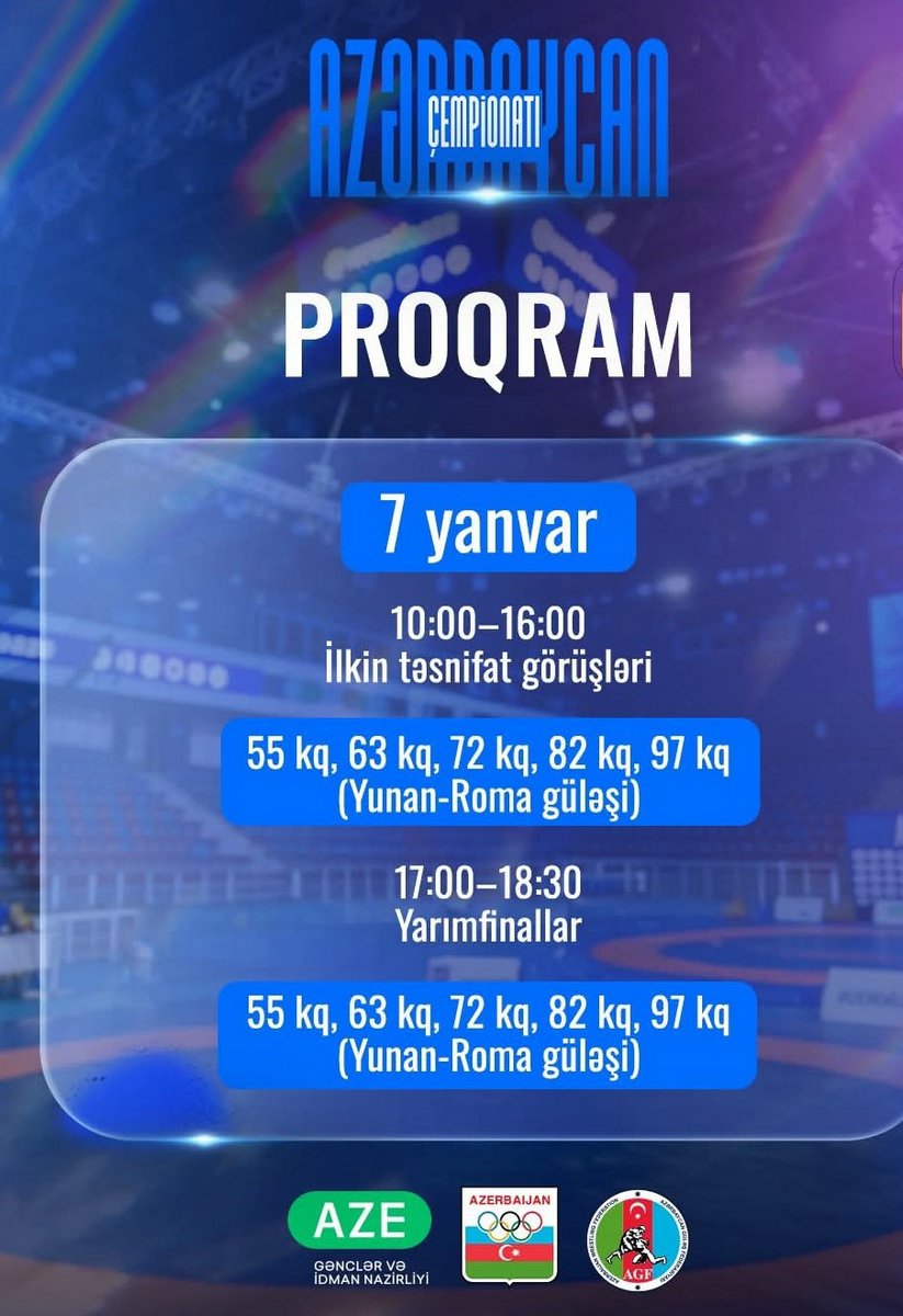 Saat 11:00-dan 15: 00-dək 60, 67, 77, 87 və 130 kq çəki dərəcələrində ilkin təsnifat görüşləri baş tutacaq.