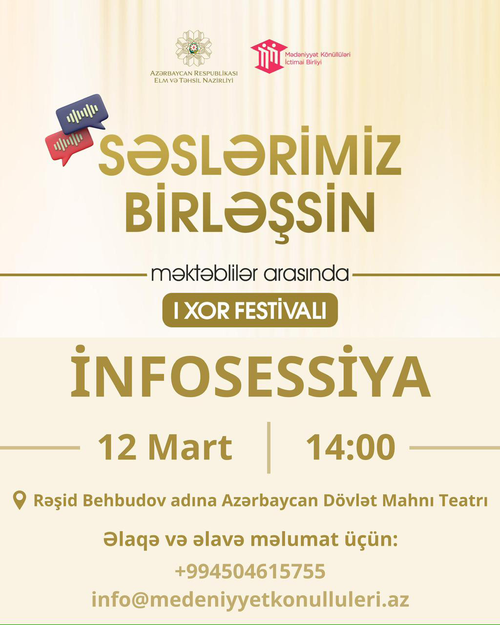 12 mart saat 14:00-da isə Rəşid Behbudov adına Azərbaycan Dövlət Mahnı Teatrında musiqi müəllimləri üçün I Xor Festivalı ilə bağlı xüsusi infosessiya keçiriləcək.