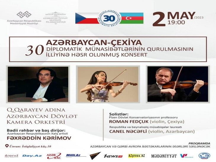May ayının 2-də Müslüm Maqomayev adına Azərbaycan Dövlət Akademik Filarmoniyasının səhnəsində Azərbaycan-Çexiya diplomatik münasibətlərinin qurulmasının 30 illiyinə həsr olunmuş konsert təşkil olunub. Tədbirin əvvəlində Çexiya Respublikasının Azərbaycan Respublikasındakı fövqəladə və səlahiyyətli Səfiri cənab Milan Sedlaçek və Milli Məclisin deputatı, Azərbaycan-Çexiya parlamentlərarası əlaqələr üzrə işçi qrupunun rəhbəri Elnur Allahverdiyev çıxış ediblər. Musiqili gecədə solistlər Plzen Dövlət Konservatoriyasının professoru Roman Fedçuk, respublika və beynəlxalq müsabiqələr laureatı Canel Nəcəfli Qara Qarayev adına Azərbaycan Dövlət Kamera Orkestrinin (bədii rəhbər və baş dirijor Azərbaycan Respublikasının Xalq artisti Fəxrəddin Kərimov) müşayiəti altında çıxış edibər. Proqramda Azərbaycan və Qərbi-Avropa bəstəkarlarının əsərləri səslənib.