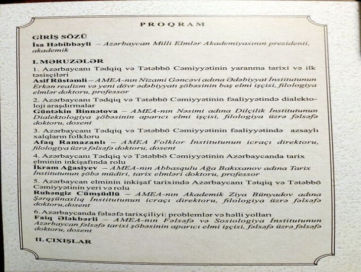 Azərbaycan Milli Elmlər Akademiyasını beş qatlı möhtəşəm elm məbədinə bənzətsək onun ən mötəbər birinci qatı - Azərbaycanı Tədqiq və Tətəbbö Cəmiyyətidir. Altı ilə böyük elm yolu qət edən Cəmiyyəti yaradanların ruhu şad olsun. Onların hər birinin adı yüksək kürsülərdən yad edilməyə layiqdir.