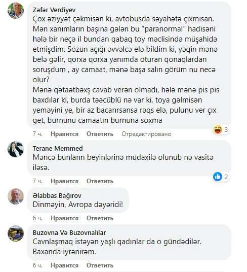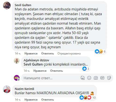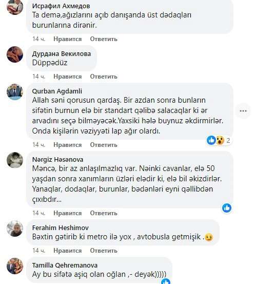 Mən də adətən metroda, avtobusda müşahidə etməyi xoşlayıram. Şəxsən mən ehtiyac olmadan ( tutaq ki, qəza keçirib, məcburdur əməliyyat etdirməyə) estetik əməliyyat etdirən qadınları normal hesab etmirəm. Mən qadınların qaşlarına da baxıram. Allahın bəxş etdiyi qaşı qoruyub saxlayanlar çox azdır. Hətta 50-60 yaşlı qadınlarn da qaşları " qələmlə" çəkilib. Eləcə də qadınların 99 faizi saçına rəng qoyur. 17 yaşlı qız saçına niyə rəng qoyur, baş açmıram