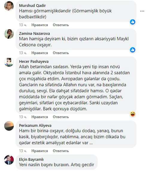 Dünən şəhərin bu başından o başına avtobusda getdim, təxminən 50 dəqiqə camaatı müşahidə etmişəm. 35-40 yaşından yuxarı qadınların heç biri digərinə oxşamır. Kişilər, oğlanlar da həmçinin. O ki, qaldı qızlara, hamısı bir sifətdədi, adam qorxur ki, ay başına dönüm, bu qız bir dayanacaq əvvəl düşmədı? Rəsmən Zombilənd...
