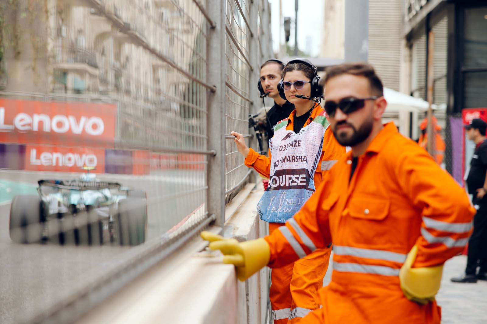 Ümumilikdə, marşallar zədələnmiş 6 bolidin tam bərpasını həyata keçirdi, 1-ci, 3-cü, 4-cü və 15-ci döngələrdə baryerləri yoxlayıb bərpa etdilər və hər qırmızı bayraqdan sonra trasın təhlükəsizliyini bərpa etmək üçün dağıntıların təmizlənməsini təşkil etdilər.
