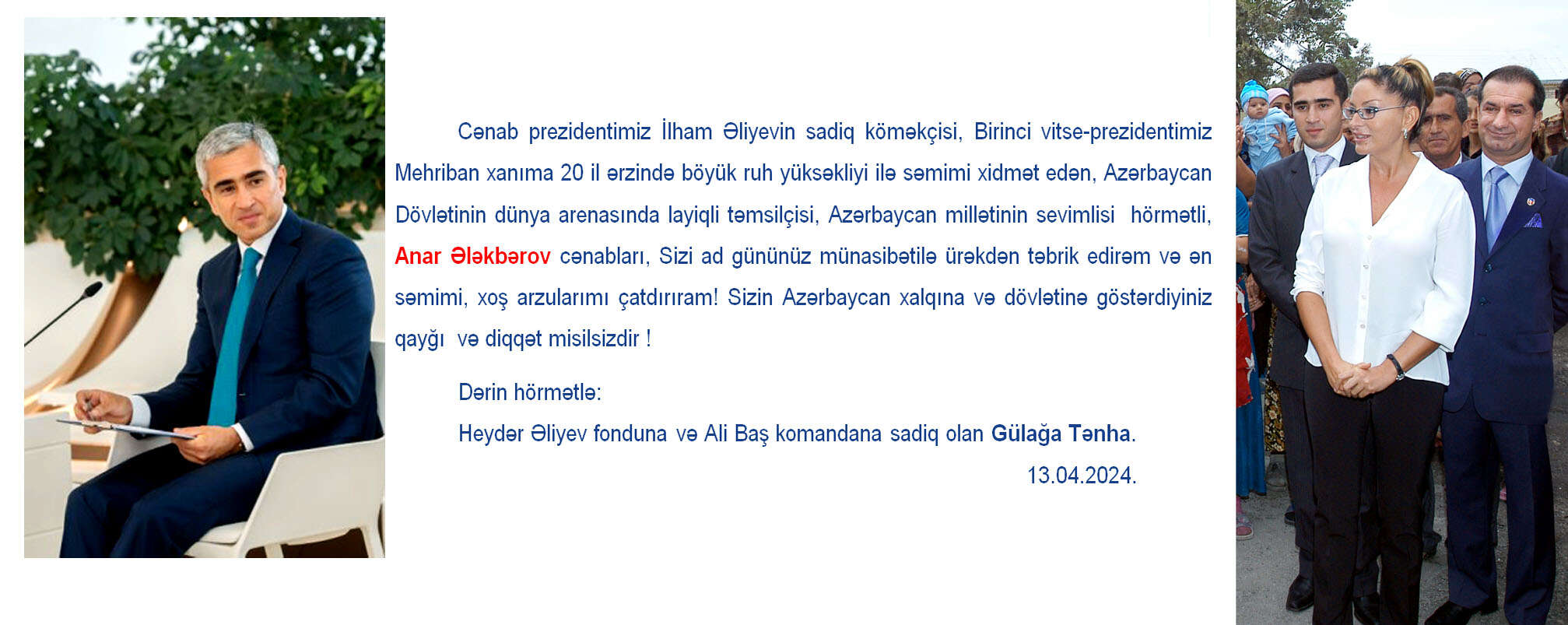 Cənab prezidentimiz İlham Əlievin sadiq köməkçisi, Birinci vitse-prezidentimiz Mehriban xanıma 20 il ərzində böyük ruh yüksəkliyi ilə səmimi xidmət edən, Azərbaycan Dövlətinin dünya arenasında laiqli təmsilçisi, Azərbaycan millətinin sevimlisi hörmətli Anar Ələkbərov cənabları, Sizi ad gününüz münasibətilə ürəkdən təbrik edirəm və ən səmimi, xoş arzularımı çatdırıram! Sizin Azərbaycan xalqına və dövlətinə göstərdiyiniz qayğı və diqqət misilsizdir!