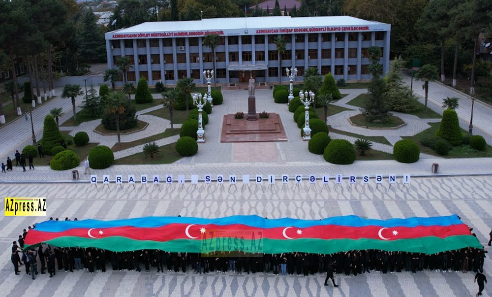 Tədbirin növbəti mərhələsində gənclər etüdniklərdəki fotoları çevirərək onların arxa tərəfində yazılmış “QARABAĞ, SƏN DİRÇƏLİRSƏN!” şüarını üzə çıxarıblar. Eyni anda meydanın ortasında 24 metr uzunluğunda Azərbaycan bayrağı açılıb. Bayraq dalğalanarkən fon musiqisi kimi Xalq artisti Polad Bülbüloğlunun “Qarabağım” mahnısı səslənib.