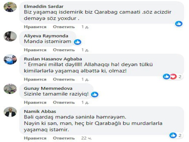 Mən Qarabağda ermənilərlə bir yerdə yaşamaq istəmirəm! Evimi, yurdumu dağıdıblar, 30 il məni, ailəmizi, Qarabağlıları çöllərə salıblar! Dövlət müstəqilliyimizi təhdid ediblər, suvernliyimizi pozublar! Körpələrimizə belə rəhm etməyiblər! Şıxbablaıda qəbristanlığmızı bulduzerlə kürüyüblər! Sözlə izah edə bilmirəm tam. Yurdu dağıdılanlar, xaraba qalanlar, əzizləri şəhid olanlar bilər nə deyirəm.