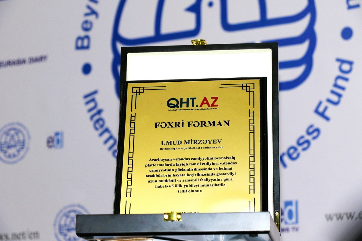 Beynəlxalq Avrasiya Mətbuat Fondunun sədri Ümid Mirzəyev Azərbaycan vətəndaş cəmiyyətini beynəlxalq platformalarda layiqincə təmsil etdiyinə, vətəndaş cəmiyyətinin gücləndirilməsi, ictimai təşəbbüslərin təşviqi və həyata keçirilməsi istiqamətində göstərdiyi uzunmüddətli və səmərəli fəaliyyətinə görə, həmçinin 65 illik yubileyi münasibətilə QHT.az Platforması tərəfindən təltif olunub.
