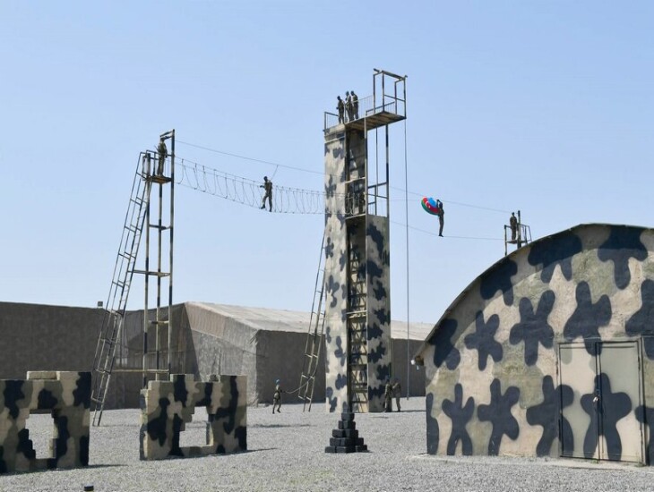 Hərbi hissədəki açıq idman şəhərciyində isə güc məşğələlərinin icrası üçün avadanlıqlar, dözümlülüyün artırılması məqsədilə maneələr zolağı, eləcə də futbol, voleybol, uzunluğa və hündürlüyə tullanma meydançaları yaradılıb. Ali Baş Komandan burada komandoların intensiv hazırlıq məşqlərini izlədi.
