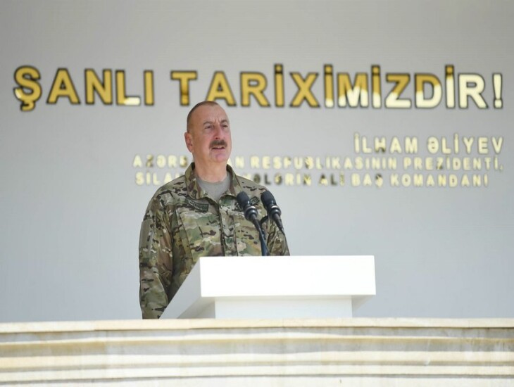 Bu gün biz öz şanlı Zəfərimizi siyasi və diplomatik müstəvidə daha da möhkəmləndirdik. Bu gün biz bölgədə söz sahibiyik. Bəziləri, o cümlədən Ermənistan və onun bəzi xarici himayədarları bizi qisasçılıqda ittiham edirlər. Tamamilə yalan bir tezisdir. Mən demişəm və müharibə dövründə demişəm ki, biz düşməndən qisasımızı döyüş meydanında alacağıq, şəhidlərimizin qanını döyüş meydanında alacağıq və belə də oldu. Azərbaycan Ordusu mülki əhaliyə qarşı müharibə aparmamışdır, bunu hər kəs bilir və görür. Ermənistandan fərqli olaraq onların şəhərlərini “İsgəndər”, “Toçka” və “Elbrus” raketləri ilə dağıtmamışıq. Azərbaycan Ordusu yüksək mənəvi xüsusiyyətlərə malikdir, Ali Baş Komandanın əmrlərini tam icra edir və icra edəcək. Ona görə bizi qisasçılıqda ittiham edənlər qoy gedib güzgüyə baxsınlar. Biz qisas yox, ədalət tələb edirik. Biz tələb edirik ki, haqq-ədalət qorunsun. Biz tələb edirik ki, bizim daxili işlərimizə heç kim müdaxilə etməsin. Biz tələb edirik ki, bütün ölkələr sözdə yox, əməldə bizim ərazi bütövlüyümüzə hörmətlə yanaşsın və belə olan halda biz də onların ərazi bütövlüyünə hörmətlə yanaşacağıq. Əks təqdirdə bizim də addımlarımız adekvat olacaq. Yenə də deyirəm, biz qisasımızı döyüş meydanında aldıq. Ancaq bununla bərabər, biz erməni vəhşiliklərini heç vaxt unutmamalıyıq. İşğal dövründə bizim şəhərlərimiz yerlə-yeksan edilmişdir. Tarixi abidələrimiz dağıdılmışdır. Bizim müqəddəs ocaqlarımız təhqir edilmiş və dağıdılmışdır. Bunu edən bizim mənfur qonşularımız idi. Buna göz yuman beynəlxalq aləm, beynəlxalq ictimaiyyət və indi hər gün Ermənistana baş çəkən rüşvətxor Avropa məmurları və deputatlarıdır. Onları bu ədalətsizliyə vadar edən nədir? İkili standartlar və rüşvət! Bunun başqa izahatı ola bilməz. Gedirlər, bizim sərhədimizə yaxın yerlərdə şəkillər çəkdirirlər, bizə hansısa mesajlar ünvanlayırlar. Hünərləri varsa gəlsin yaxınlaşsın bizim sərhədimizə. O vaxtlar artıq tarixdə qaldı. Yenə də onların ayağını biz qırdıq. Çünki İkinci Qarabağ müharibəsindən sonra biz bunu unutmamışıq. Bəzi Avropa ölkələrinin rəsmi nümayəndələri bizim ərazimizə, Xankəndiyə icazəsiz soxulmuşdular. Mən o vaxt demişdim ki, əgər bizim bundan xəbərimiz olsaydı, onları buraxmayacaqdıq. Bu gün də deyirəm, hünəriniz varsa gəlin, görək sonra axırınız nə olacaq?