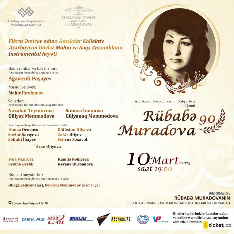 Martın 10-da Azərbaycan Dövlət Akademik Filarmoniyasının səhnəsində Azərbaycan Respublikası Mədəniyyət Nazirliyinin təşkilatçılığı ilə Azərbaycan Respublikasının Xalq artisti Rübabə Muradovanın 90 illiyinə həsr olunmuş konsert keçirilib.