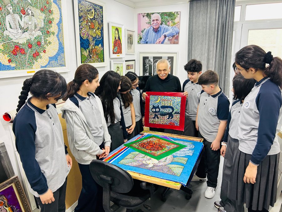 Məhz bu məqsədlə təşkil olunan ən dəyərli tədbirlərdən biri də Azərbaycan Respublikasının Xalq Rəssamı, professor, “Şöhrət” ordenli Arif Hüseynovun emalatxanasına təşkil edilən səfər oldu. Arif Hüseynov Azərbaycan təsviri sənətinin canlı klassiklərindən biri olaraq yaradıcılığı, milli ruhu əks etdirən obrazları, dərin ideya yükü daşıyan əsərləri ilə tanınır. Onun emalatxanası şagirdlər üçün sadəcə bir iş məkanı deyil, incəsənətin iç nəfəsini hiss edəcəkləri, əsərlərin doğulduğu atmosferi görəcəkləri canlı bir yaradıcılıq məkanıdır. Şagirdlər emalatxananın hər guşəsinə maraqla baxaraq rəssamın iş prosesi, istifadə etdiyi texnika, yaradıcılıq fəlsəfəsi və Azərbaycan təsviri sənətindəki mövqeyi haqqında öz dilindən məlumat aldılar. Arif Hüseynovun emalatxanası şagirdlərin gözündə sanki kiçik bir muzeyə çevrilərək onları rənglərin, obrazların və yaradıcılıq ruhunun sehrinə qərq etdi. Şagirdlər gördükləri əsərlərin ruhunu duyaraq təsviri incəsənətin yalnız nəzəriyyədən ibarət olmadığını, onun həyatla nəfəs aldığını hiss etdilər. Uşaqların üzlərindəki maraq, gözlərindəki parıltı və rəssama ünvanladıqları suallar onların bu görüşdən qidalandıqlarını göstərirdi. Bu tədbir onların yaddaşında təkcə bir ekskursiya deyil, gələcək baxışlarına təsir edən ilham olub, dünyagörüşlərini daha da genişləndirərək milli dəyərlərə bağlılığı möhkəmləndirdi. Bu cür görüşlər mədəniyyətimizin gələcək nəsillərə sevgi ilə ötürülməsi baxımından son dərəcə əhəmiyyətlidir.