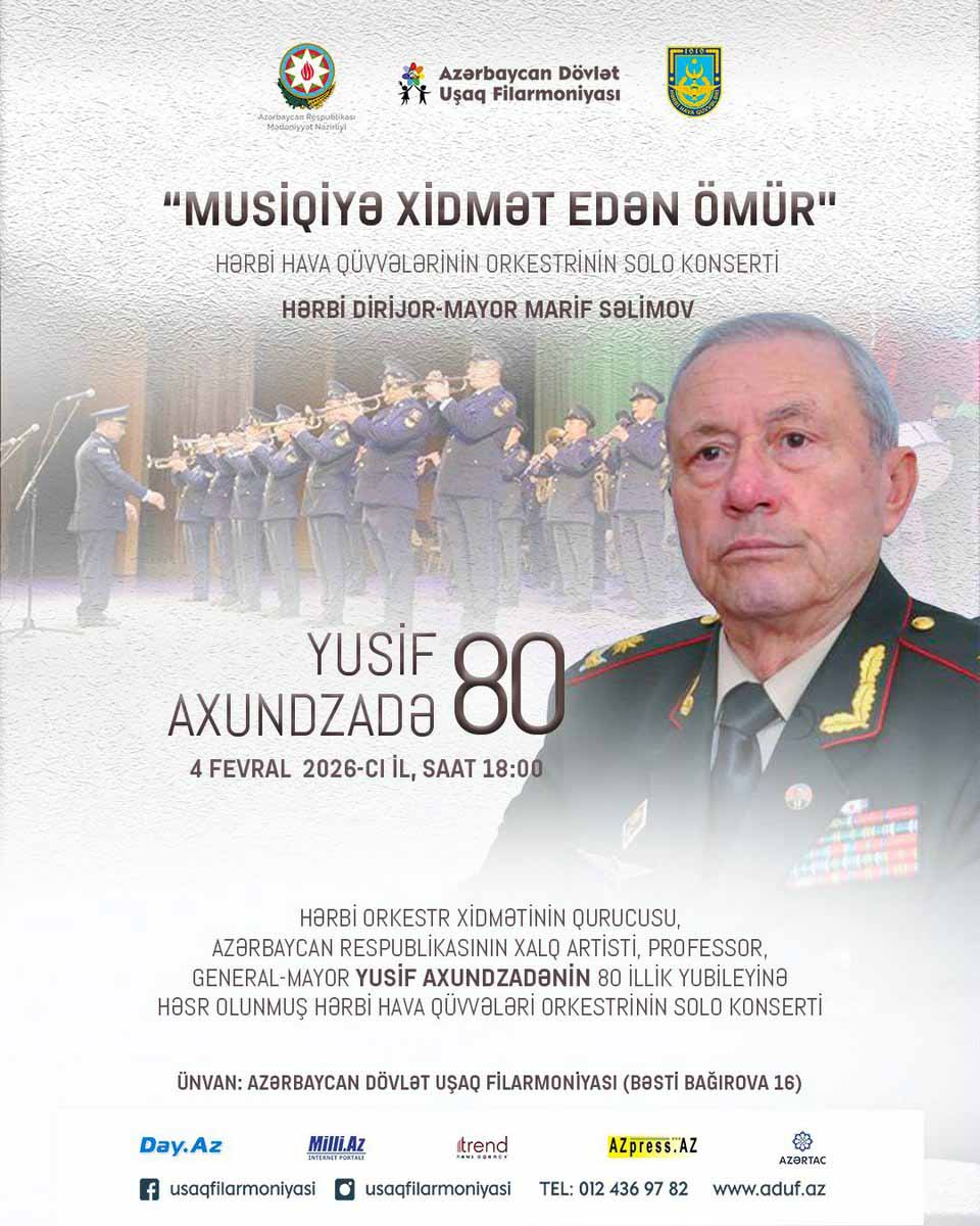 4 fevral 2026-cı il Azərbaycan musiqi və hərbi orkestr xidməti və musiqi sənətinin görkəmli nümayəndəsi, general-mayor, professor, Xalq artisti Yusif Axundzadənin 80 illik yubileyi Azərbaycan Dövlət Uşaq Filarmoniyasında qeyd olunacaq.