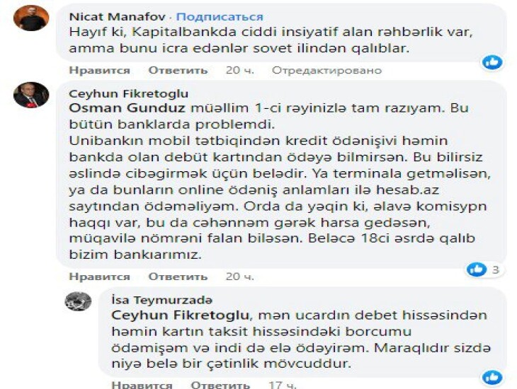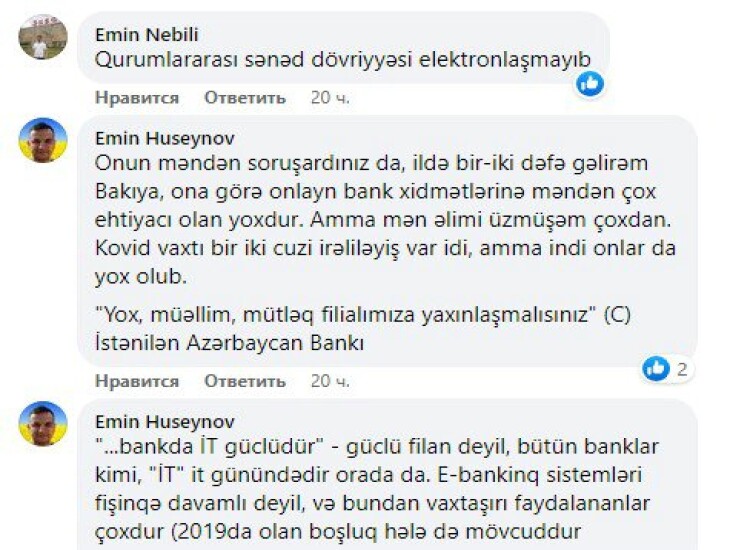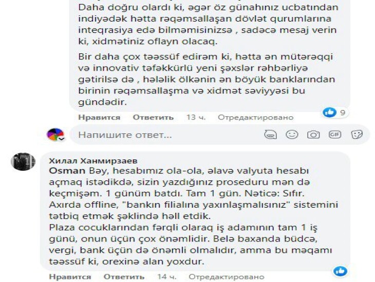 Yəni, görünür ki, qurum mövcud bürokratik prosesi sadələşdrimədən elektrona çevirdiyindən, oflayn mühitdə nə tələb olunursa elə onu da onlaynda tələb edirlər. Yəni, daha pis mühit, elektron –bürokratik mühit yaradıblar. Amma prosesi bitirmək üçün razılaşdım. Görünür ki , bankda İT güclüdür, amma biznes analitika, data analitika zəifdir.