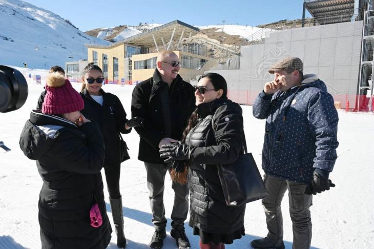 Daha sonra Prezident İlham Əliyev, birinci xanım Mehriban Əliyeva və ailə üzvləri Şahdağ Turizm Kompleksində istirahət edən insanlarla görüşdülər.