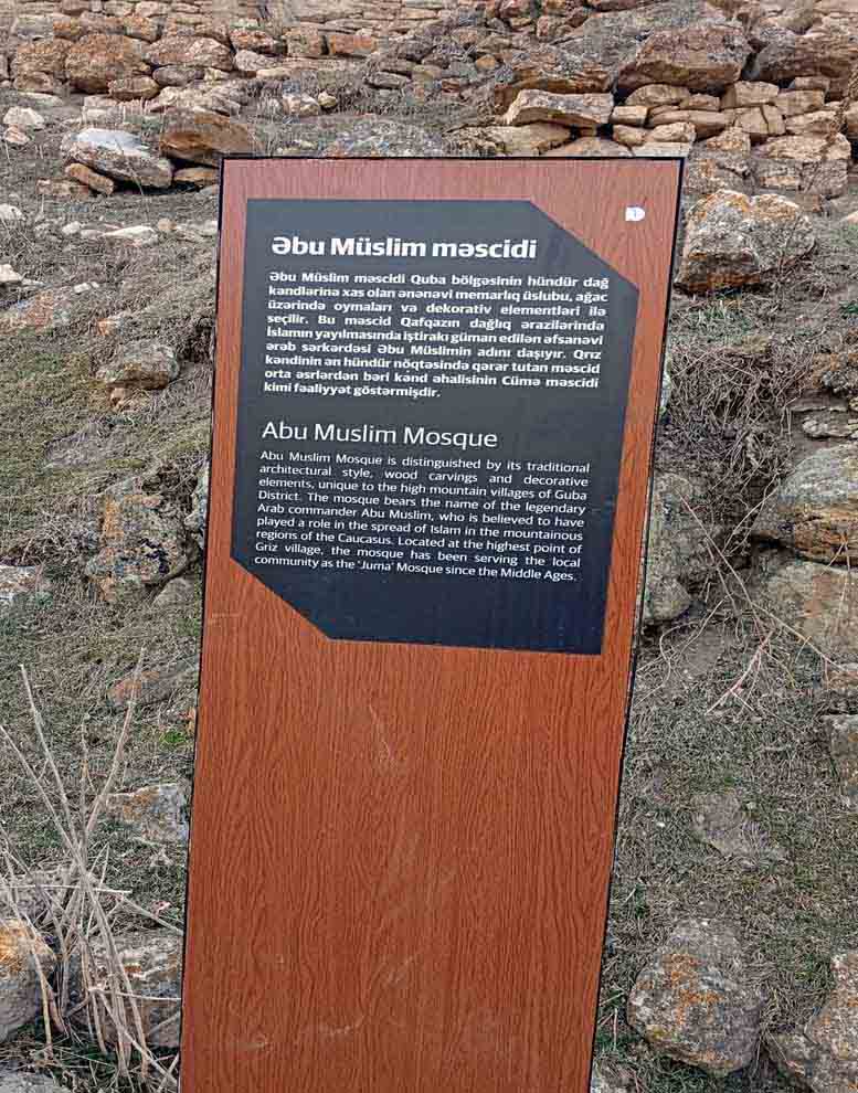Əbu Müslüm Xorasani Əməvilərə qarşı üsyan bayrağı qaldırmış, Azərbaycanın Quba rayonunun dağ kəndlərində - Qrız, Cek və Xınalıq kəndlərində bu adda məscidlər yadigar qoymuşdur. Qrız kəndindəki Əbu Müslüm məscidi kənd ağsaqqallarından Şıxbaba Mehdiyevdən aldığım məlumata görə, hicri 131, yəni miladi 748/749-cu ilə aiddir. Bu məscidi Cek və Xınalıqdan hələlik öyrəndiyim qədəri ilə fərqləndirən və onu Azərbaycanın ən qədim 3-cü məscidinə (Dərbənd, Şamaxı Cümə məscidlərindən sonra) çevirən bir mühüm əsas var. Əbu Müslüm adlı sərkərdə xorasanlı idi və bugün Qrızda Xoraşenlilər (yəni Xorasanlılar) adı ilə tanınan bir nəsil var. Məscidin qabağında tanıtım lövhəsi qoyulub. Torpağın üstündə olan bu məscid necə qorunursa, onun naxışlarla bəzədilmiş taxtaları kəndin ərazisinə səpələnib. Budurmu qorunma?..