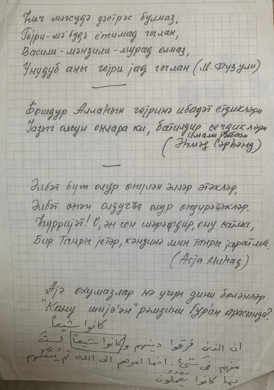 Köhnə qovluqlarıma baxarkən rast gəldim. Öz xəttilə yazdığı bu vərəqi mənə sevimlimiz, ərəbşünas, Quranın dilimizə tərcüməsi müəlliflərindən biri mərhum Tariyel Həsənov vermişdi.