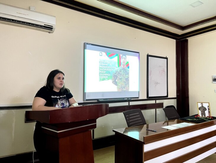 Filologiya fakültəsinin dekan müavini Anar Fərəcov xalqımızın müasir qəhrəmanlıq salnaməsinə çevrilmiş 44 günlük Vətən müharibəsində və 2023-cü ilin sentyabr ayında Qarabağda aparılan uğurlu lokal antiterror əməliyyatları nəticəsində canlarından keçmiş gənclərimizin göstərdikləri şücaətdən söz açıb. Bildirib ki, fakültənin məzunu, Murovdağ istiqamətində gedən döyüşlərdə şəhidlik zirvəsinə ucalmış Kənan Məmmədov müəllimlərinin yaddaşında məsuliyyətli, dərslərinə ciddi yanaşan və mehriban bir tələbə portreti yaratmağı bacarıb. Onun əziz xatirəsi həmişə ehtiramla yad olunacaq.