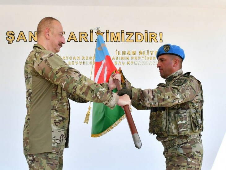 Müzəffər Ali Baş Komandan İlham Əliyev Döyüş bayrağını hərbi hissənin komandirinə təqdim etdi.