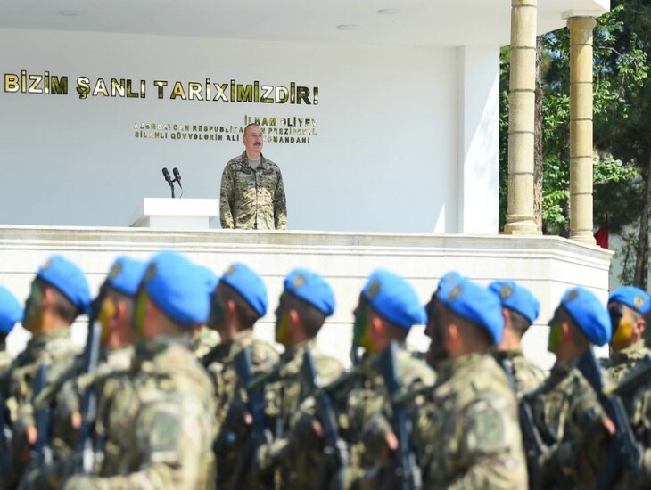 Bu gün biz öz şanlı Zəfərimizi siyasi və diplomatik müstəvidə daha da möhkəmləndirdik. Bu gün biz bölgədə söz sahibiyik. Bəziləri, o cümlədən Ermənistan və onun bəzi xarici himayədarları bizi qisasçılıqda ittiham edirlər. Tamamilə yalan bir tezisdir. Mən demişəm və müharibə dövründə demişəm ki, biz düşməndən qisasımızı döyüş meydanında alacağıq, şəhidlərimizin qanını döyüş meydanında alacağıq və belə də oldu. Azərbaycan Ordusu mülki əhaliyə qarşı müharibə aparmamışdır, bunu hər kəs bilir və görür. Ermənistandan fərqli olaraq onların şəhərlərini “İsgəndər”, “Toçka” və “Elbrus” raketləri ilə dağıtmamışıq. Azərbaycan Ordusu yüksək mənəvi xüsusiyyətlərə malikdir, Ali Baş Komandanın əmrlərini tam icra edir və icra edəcək. Ona görə bizi qisasçılıqda ittiham edənlər qoy gedib güzgüyə baxsınlar. Biz qisas yox, ədalət tələb edirik. Biz tələb edirik ki, haqq-ədalət qorunsun. Biz tələb edirik ki, bizim daxili işlərimizə heç kim müdaxilə etməsin. Biz tələb edirik ki, bütün ölkələr sözdə yox, əməldə bizim ərazi bütövlüyümüzə hörmətlə yanaşsın və belə olan halda biz də onların ərazi bütövlüyünə hörmətlə yanaşacağıq. Əks təqdirdə bizim də addımlarımız adekvat olacaq. Yenə də deyirəm, biz qisasımızı döyüş meydanında aldıq. Ancaq bununla bərabər, biz erməni vəhşiliklərini heç vaxt unutmamalıyıq. İşğal dövründə bizim şəhərlərimiz yerlə-yeksan edilmişdir. Tarixi abidələrimiz dağıdılmışdır. Bizim müqəddəs ocaqlarımız təhqir edilmiş və dağıdılmışdır. Bunu edən bizim mənfur qonşularımız idi. Buna göz yuman beynəlxalq aləm, beynəlxalq ictimaiyyət və indi hər gün Ermənistana baş çəkən rüşvətxor Avropa məmurları və deputatlarıdır. Onları bu ədalətsizliyə vadar edən nədir? İkili standartlar və rüşvət! Bunun başqa izahatı ola bilməz. Gedirlər, bizim sərhədimizə yaxın yerlərdə şəkillər çəkdirirlər, bizə hansısa mesajlar ünvanlayırlar. Hünərləri varsa gəlsin yaxınlaşsın bizim sərhədimizə. O vaxtlar artıq tarixdə qaldı. Yenə də onların ayağını biz qırdıq. Çünki İkinci Qarabağ müharibəsindən sonra biz bunu unutmamışıq. Bəzi Avropa ölkələrinin rəsmi nümayəndələri bizim ərazimizə, Xankəndiyə icazəsiz soxulmuşdular. Mən o vaxt demişdim ki, əgər bizim bundan xəbərimiz olsaydı, onları buraxmayacaqdıq. Bu gün də deyirəm, hünəriniz varsa gəlin, görək sonra axırınız nə olacaq?