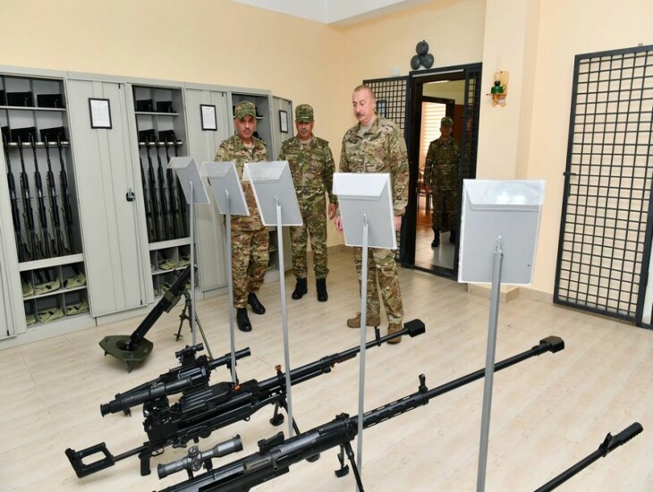 Sonra Ali Baş Komandan əsgər yataqxanasında yaradılan şəraitlə tanış oldu, oradakı silah otağı, əşya anbarı, şəxsi heyətin mənəvi-psixoloji hazırlığı üçün ideoloji iş və digər inzibati otaqlara baxdı. Silah otağında Prezident İlham Əliyevə əksəriyyəti Azərbaycan istehsalı olan silah nümunələrinin taktiki-texniki xüsusiyyətləri barədə məlumat verildi.
