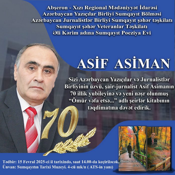 Sizi tanınmış şair, Azərbaycan Yazıçılar və Jurnalistlər Birliklərinin üzvü, "Ürəkdə od varsa", "Bu da bir taledi", "Ömrümə-günümə açılan yollar", "Bitməyəcək ölənəcən bu sevdam", "Unutsaq unudularıq", "Mənim dəniz sevgim", "Bu dünyaya qərib gəldim", "Biz niyə vaxtında görüşməmişik", "Ayrılıqdan o yana", "Yollar könül sirdaşımdı" və "Ömür vəfa etsə..." kitablarının müəllifi ASİF ASİMANın 70 illik yubileyi münasibətilə təşkil olunan tədbirə dəvət edirik.