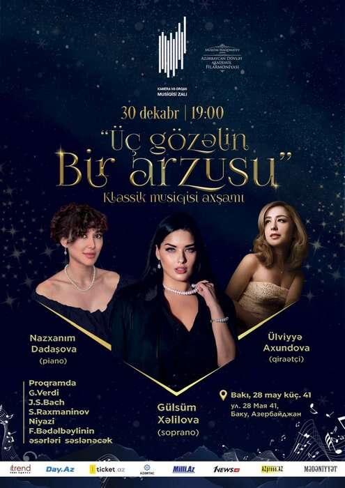 30 dekabr tarixində saat 19:00-da Kamera və Orqan Musiqisi Zalında “Üç gözəlin bir arzusu” adlı klassik musiqi və poeziya ilə zəngin sehrli bir gecə keçirildi. Musiqili gecədə Respublika və beynəlxalq müsabiqələr laureatları Gülsüm Xəlilova (soprano, Ü.Hacıbəyli adına Bakı Musiqi Akademiyasının məzunu) və Nazxanım Dadaşova (piano, P.Çaykovski adına Moskva Konservatoriyasının məzunu, Prezident təqaüdçüsü) dinləyicilər qarşısında çıxış etdilər. Ədəbi hissəni şairə, ssenarist, Azərbaycan Yazıçılar Birliyinin üzvü, bir çox incəsənət layihələrinin müəllifi Ülviyyə Axundova təqdim etdi. Proqrama Azərbaycan, Qərbi Avropa və rus bəstəkarlarının əsərləri daxil idi. Gecənin kulminasiya anı isə Fərhad Bədəlbəylinin “Ave Maria” əsərinin ifası oldu. Kompozisiya 2024-cü il dekabrın 25-də baş verən təyyarə qəzasında həyatını itirənlərin xatirəsinə həsr olunaraq, bir dəqiqəlik sükutla tamamlandı. Layihənin yaradıcıları prodüser və rejissor Əjdar Ulduz, PR və marketinq meneceri Kamilə Rəhimlidir.